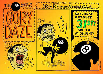 White River Junction's annual Gory Daze Halloween Parade and Costume Ball is coming up and the (officially anonymous) members of the Rio Blanco Social Club would like to extend a cordial invite to You—to Everyone, young and old alike! People ask if the parade is suitable for children, and we say, "Why Certainly!" Please bring the whole family. Altho there probably will be men wearing dresses in the parade. (But believe me, the man wearing a dress will be one of the Least Scary things you will see that night!)