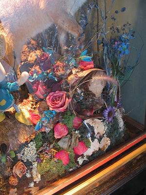 A ponderous base of birch bark and birch logs forms a plinth for the display of these two mammals. Accessories of flowers (both real and artificial), dyed grasses, mosses, lichens (including red-tipped cladonia, Cladonia cristatella (British Soldier) and others) and ornamental leaves create a pleasing impression for viewers.