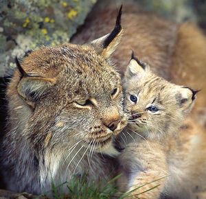 The Lynx (Lynx canadensis) with her kitten. Some authorities group this animal under felis. Its urine is said to harden into precious stones.