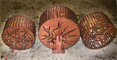 The squirrel cage designs are based on photos I took in the eastern Upper Peninsula in Michigan. The sources are: a grape arbor made from saplings, an unidentified tentacle fossil, seed pods, a waterfall, flowers, unidentified footprints in sand, a coral fossil.