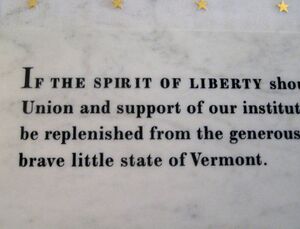 | − | + | <blockquote>Vermont is a state I love. I could not look upon the peaks of Ascutney, Killington, Mansfield, and Equinox, without being moved in a way that no other scene could move me. It was here that I first saw the light of day; here I received my bride, here my dead lie pillowed on the loving breast of our eternal hills.</blockquote> | |